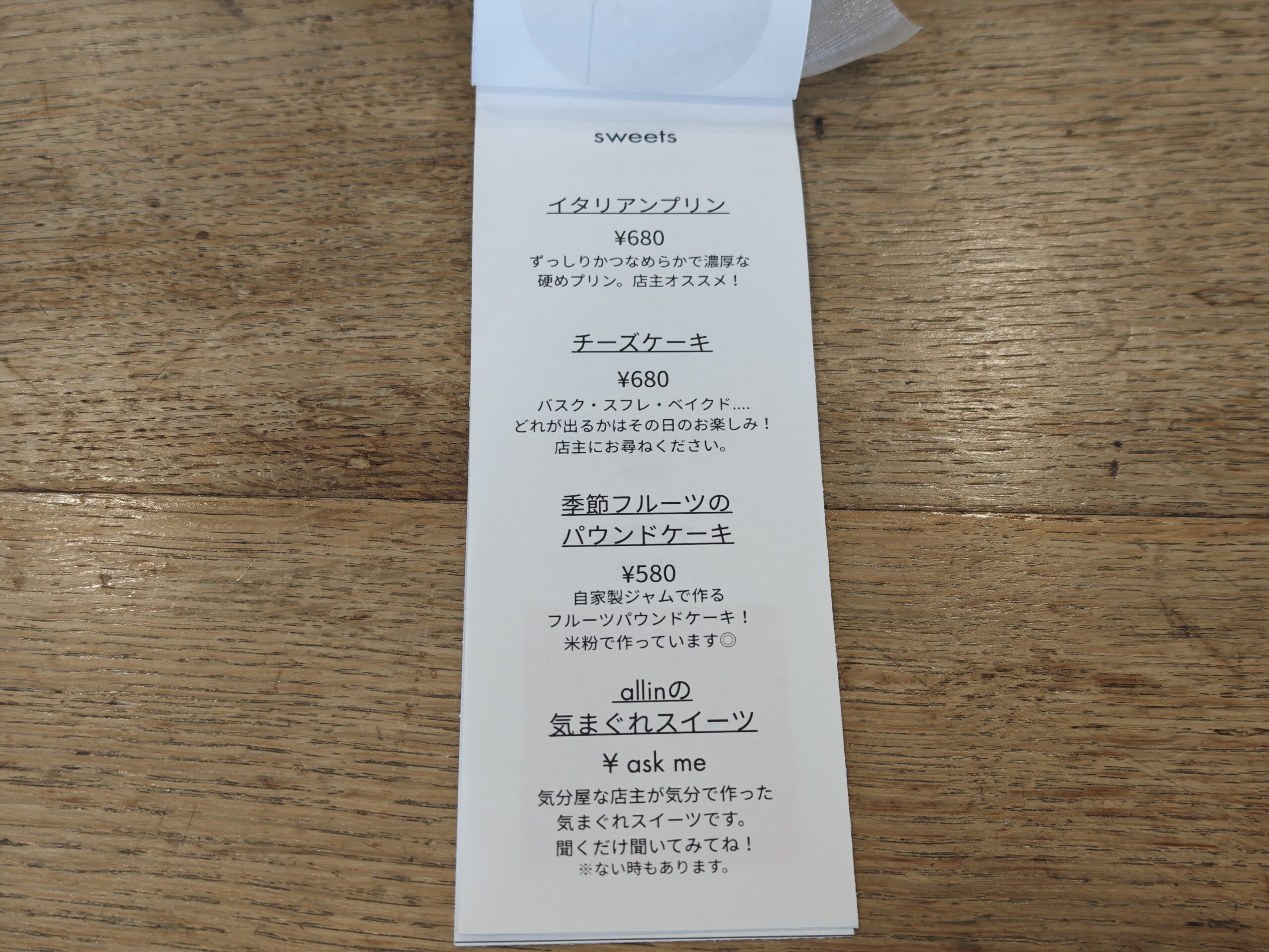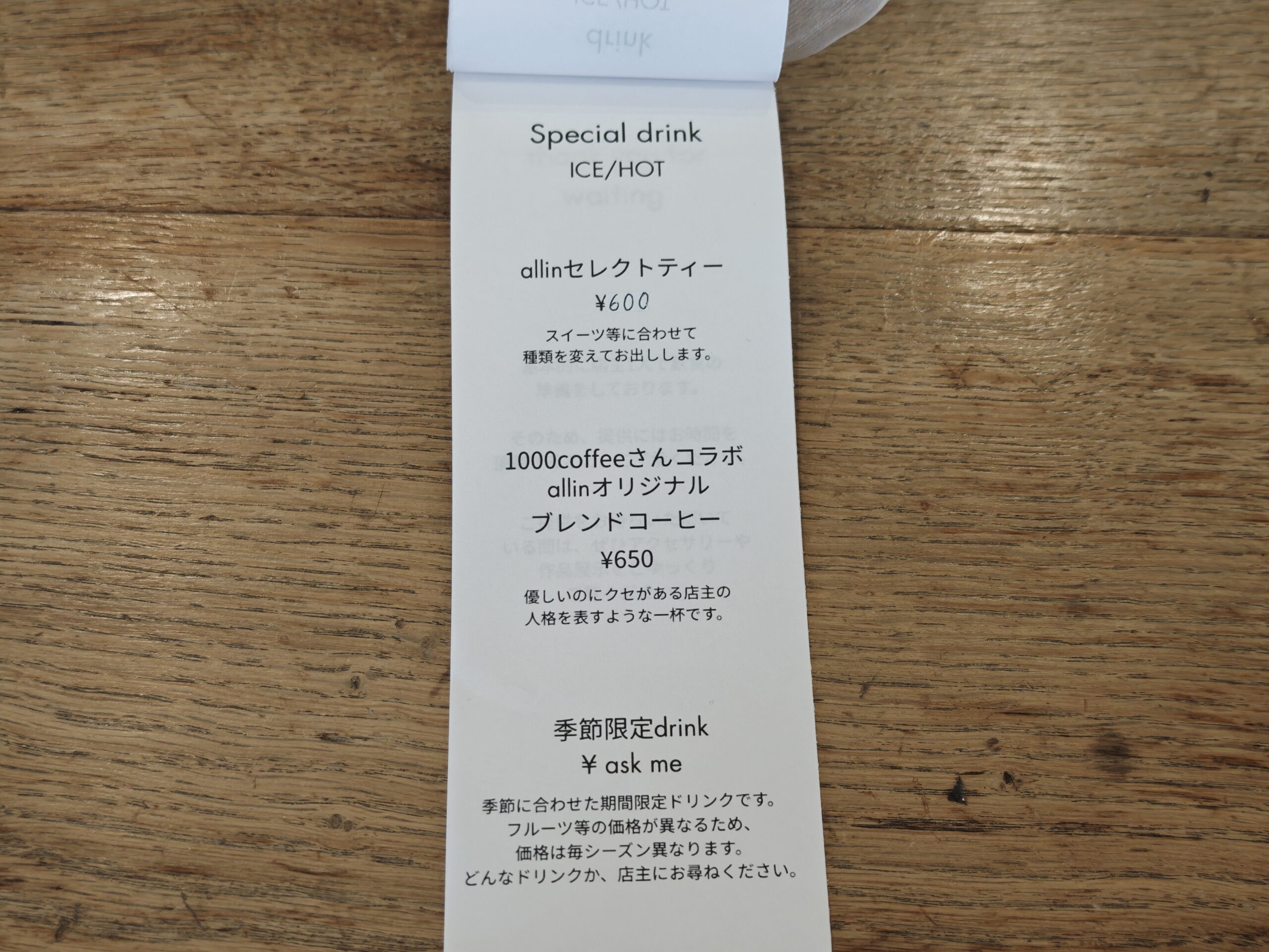 - allin気まぐれスイーツはその時々で内容が変わります。