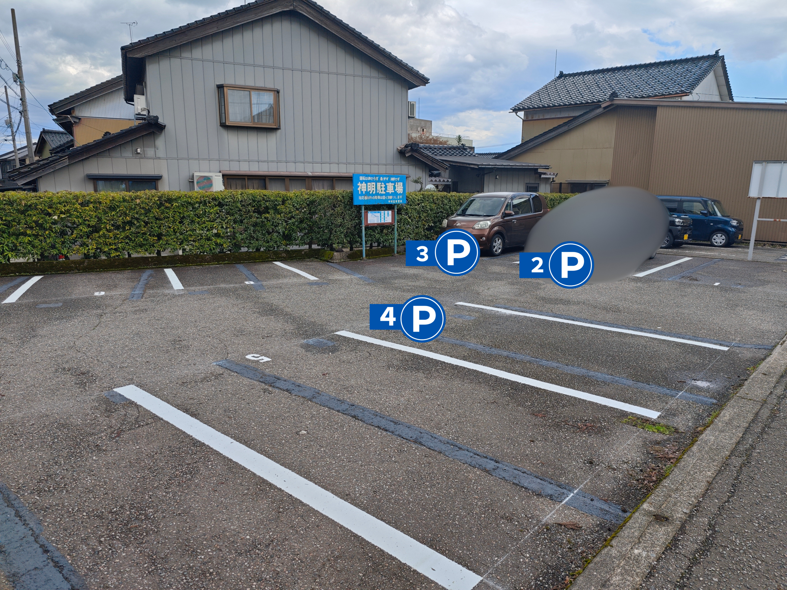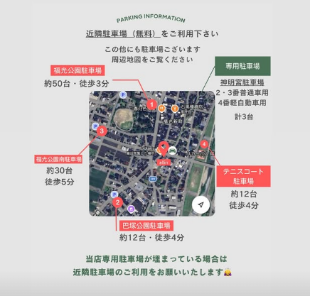 専用駐車場はお店の向かいにある「神明駐車場」に3台分あります。