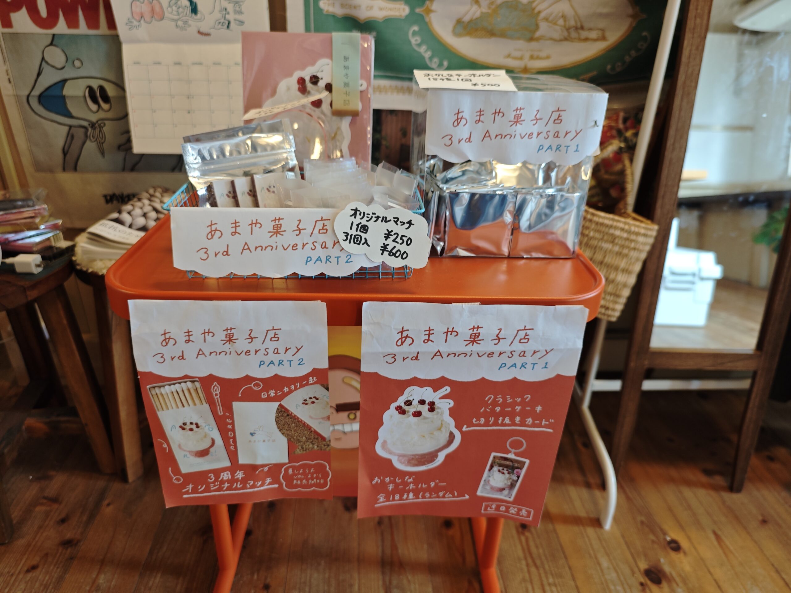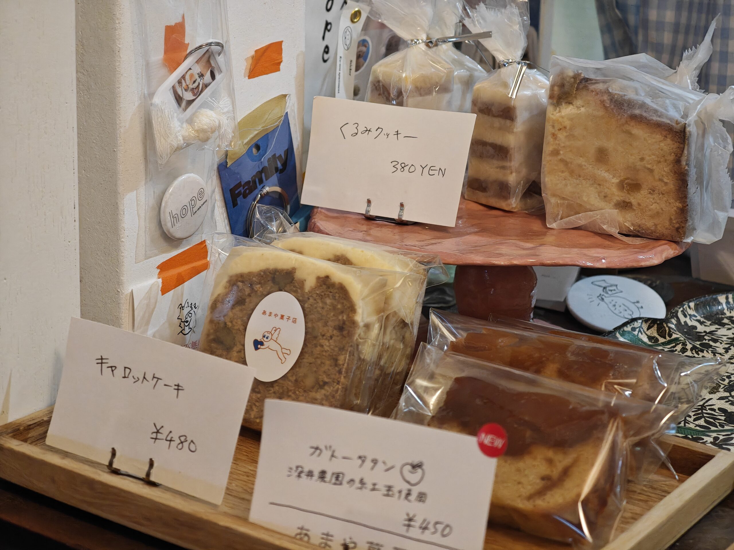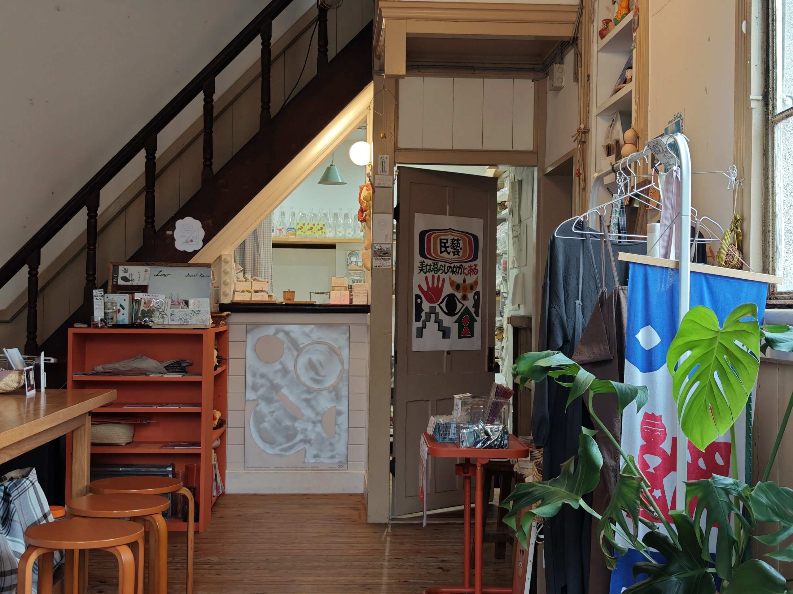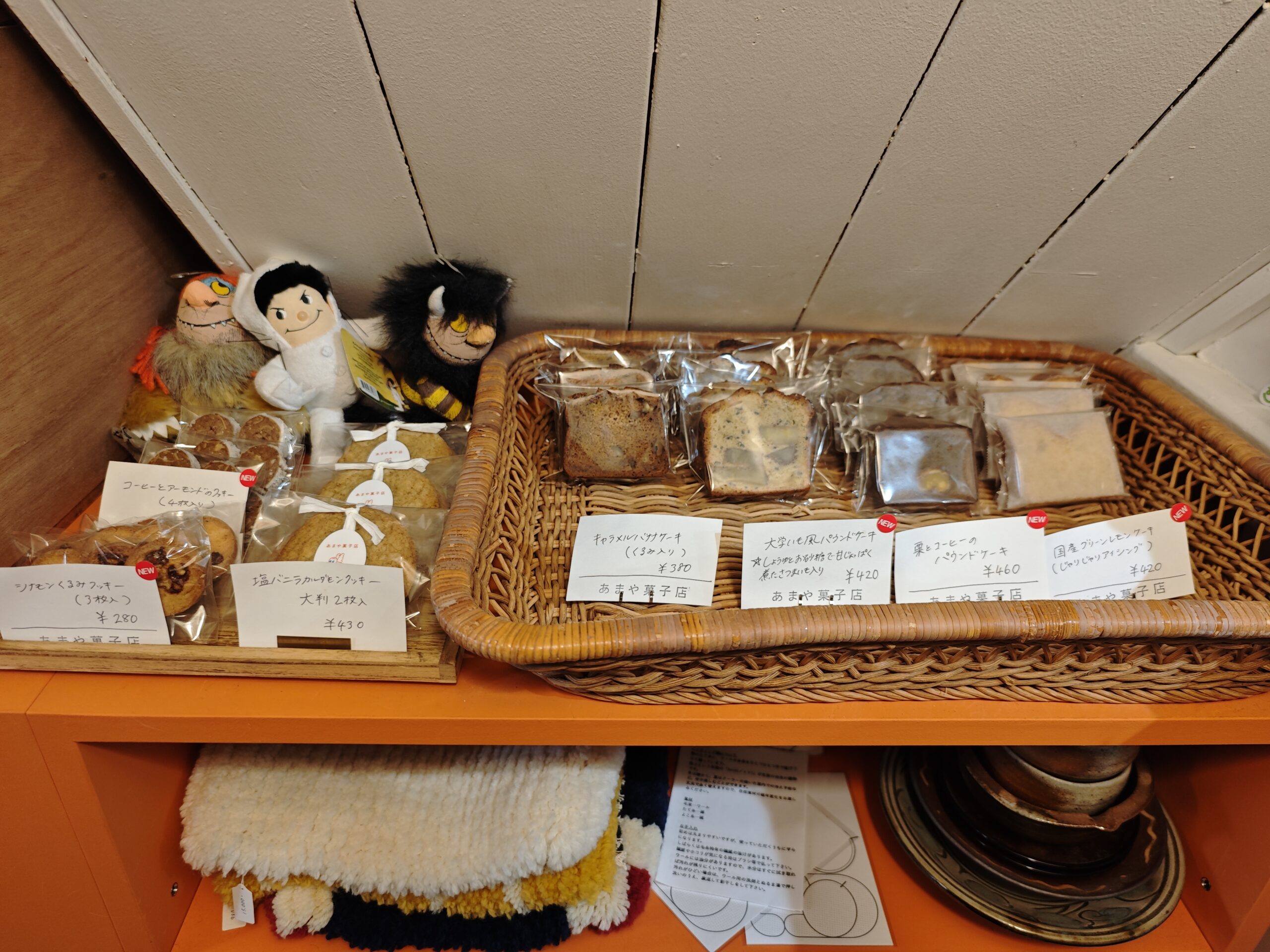 棚には焼き菓子が並び、横にはレトロ雑貨や民芸品のような小物も。