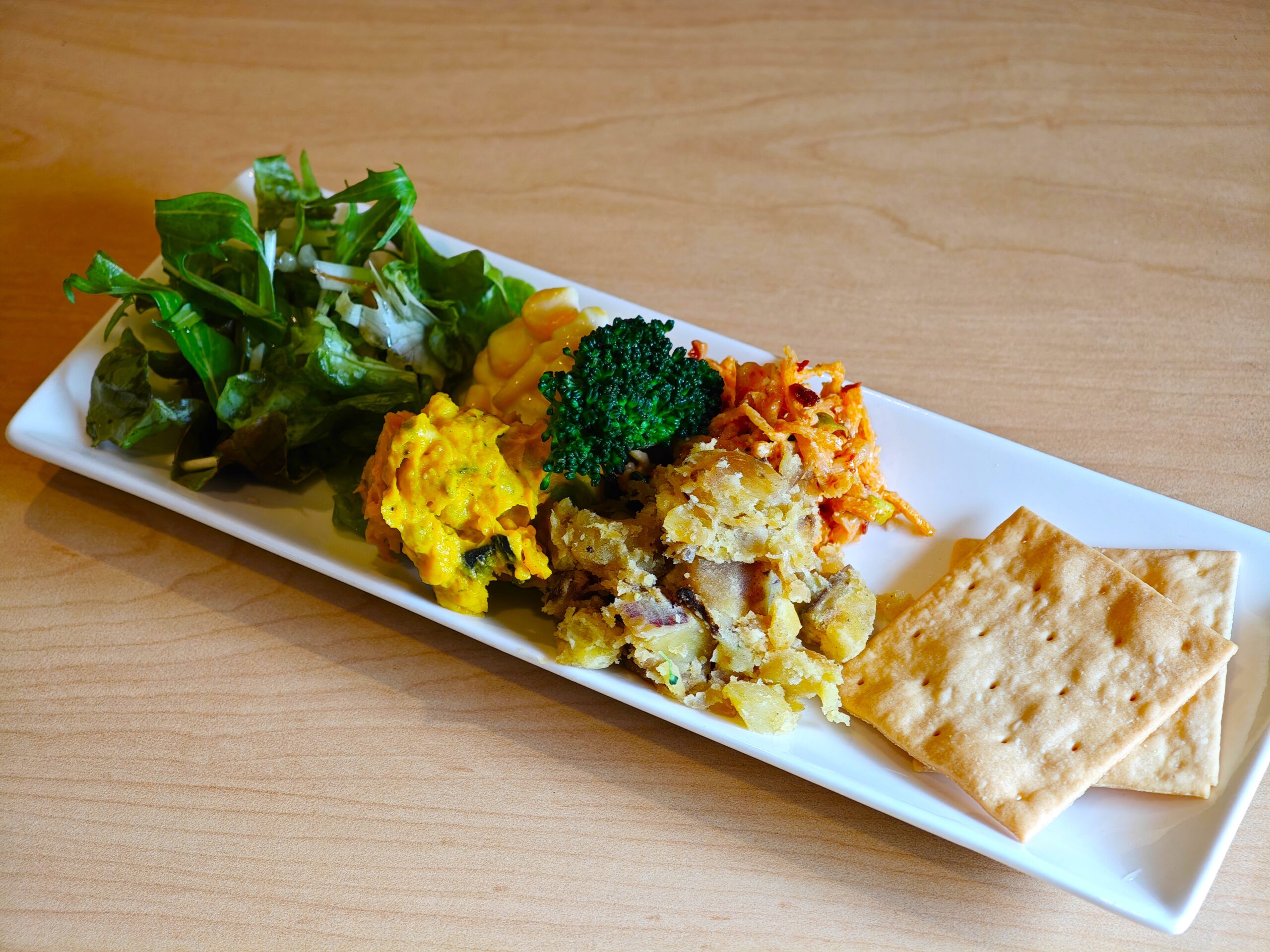 4種類ある前菜を自分でクラッカーに のせながら食べるスタイル。