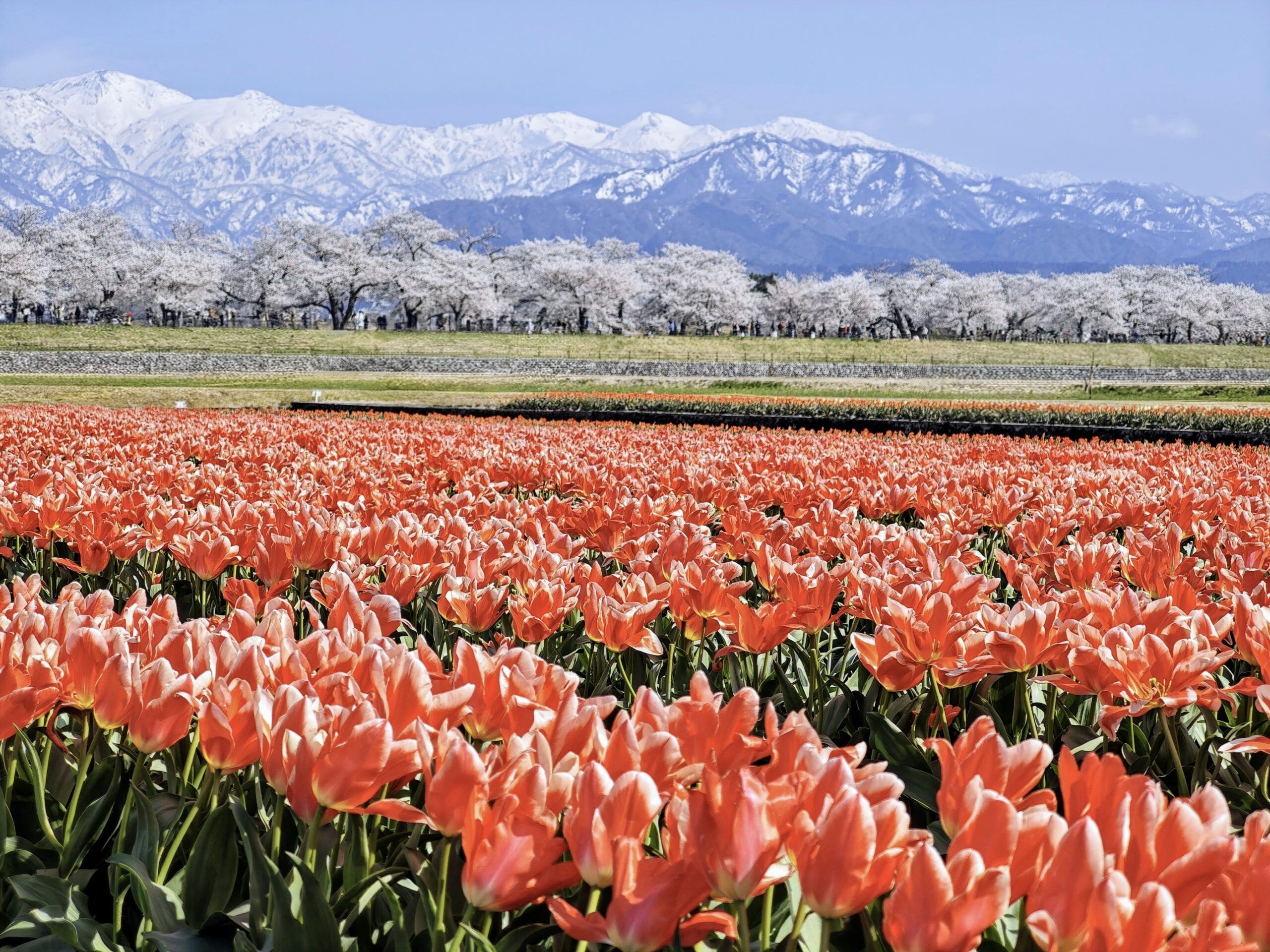 桜・チューリップ・菜の花・残雪の北アルプスが一度に楽しめる、富山を代表する春の絶景スポット。