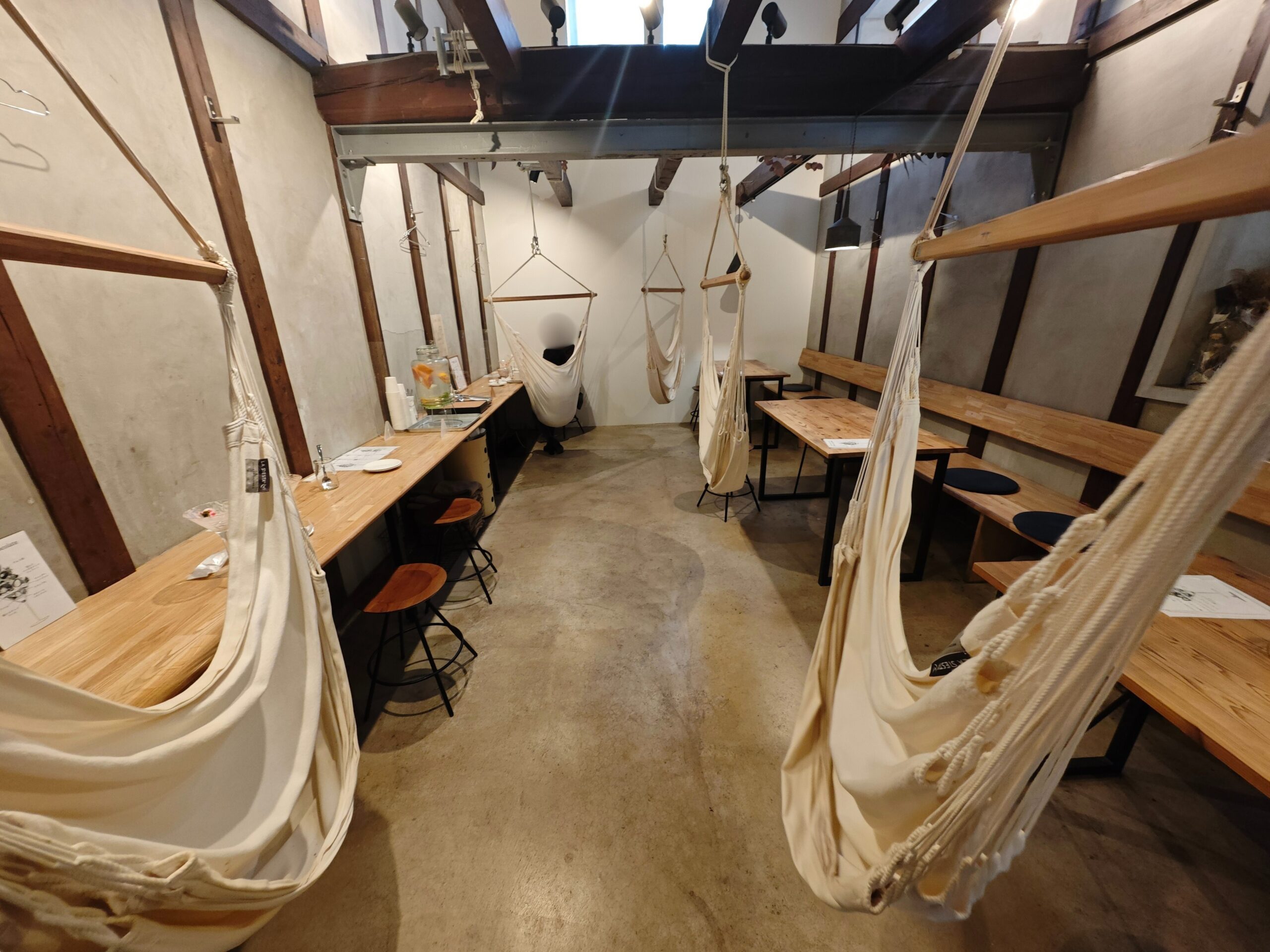 奥のカフェスペースではハンモックがゆったりと吊り下がっています