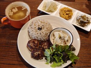 雑穀米に、野菜中心の副菜。
