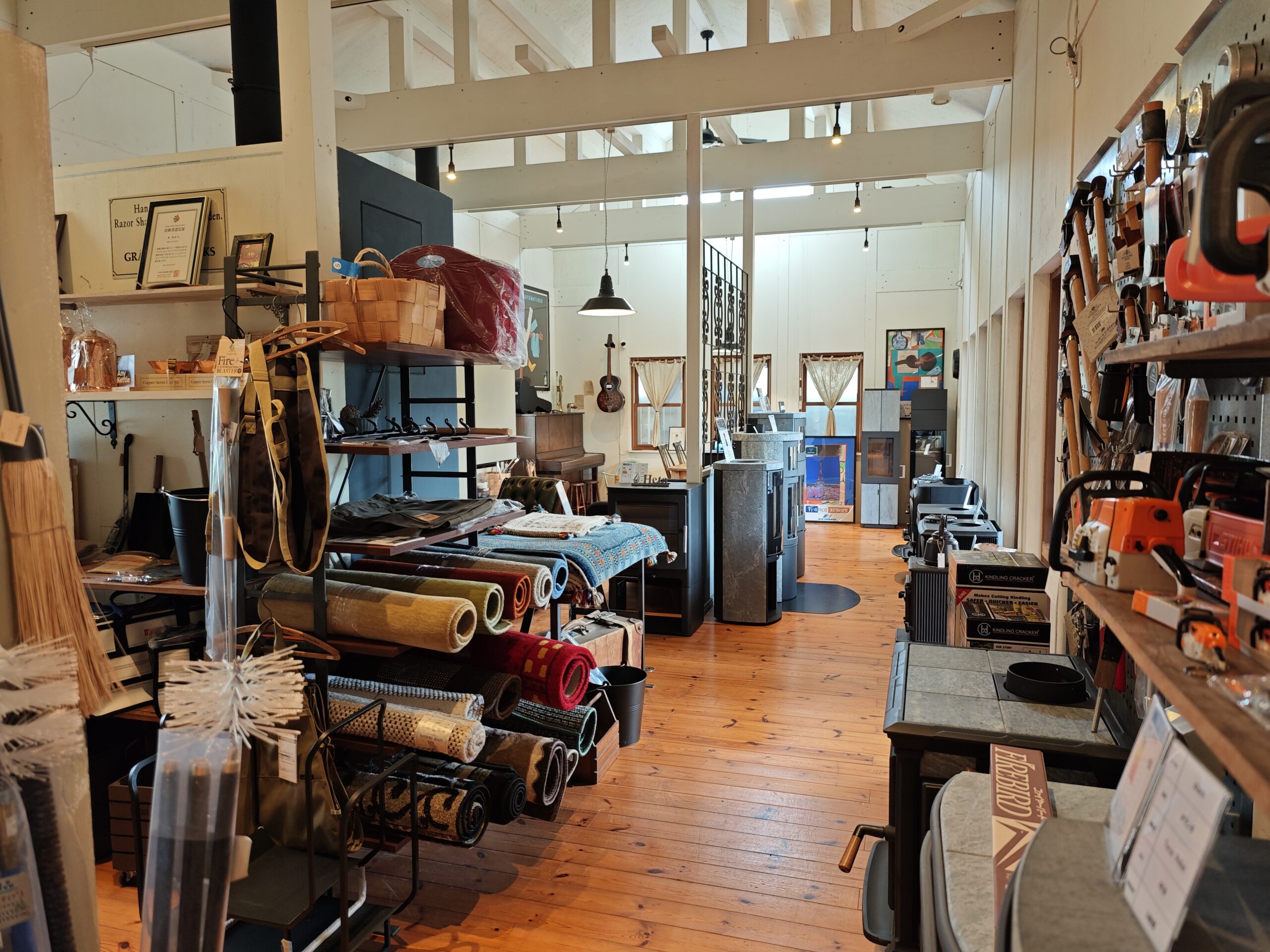 薪ストーブや雑貨が並び、あたたかみのある空間が広がっています。