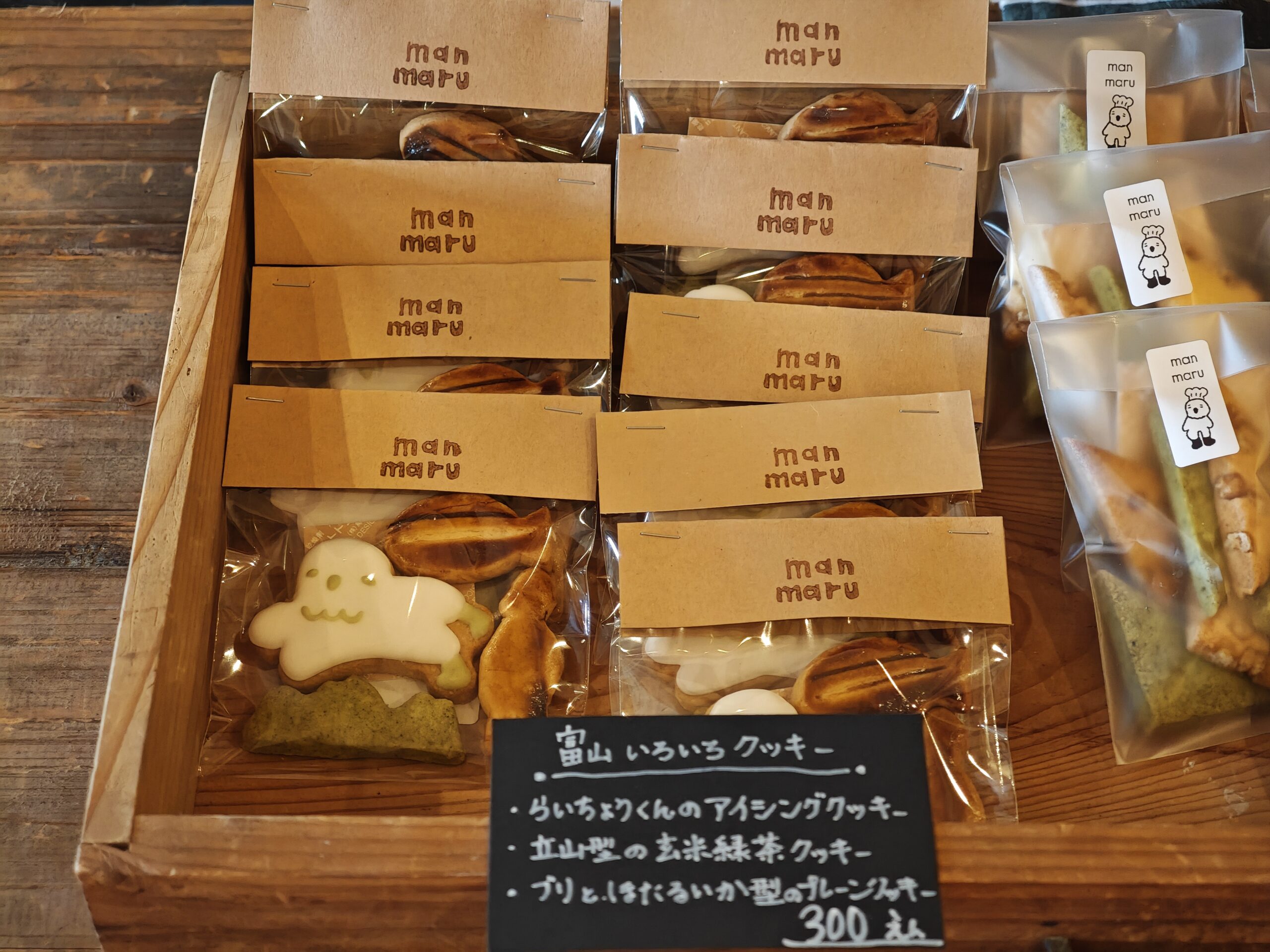 お店のキャラクター「らいちょうくん」や、ブリ、ホタルイカ、立山のクッキーなど。