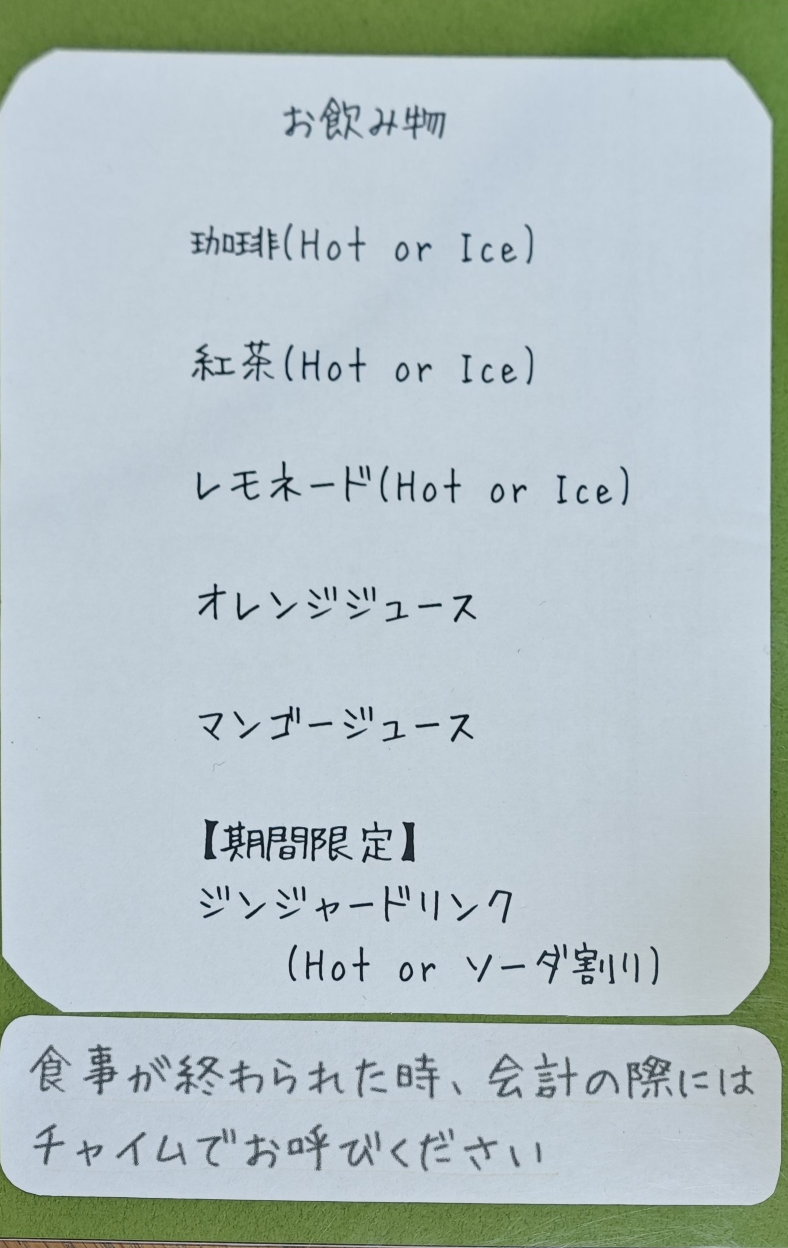 ドリンクと自家製スイーツ(1種類)も注文可能です。