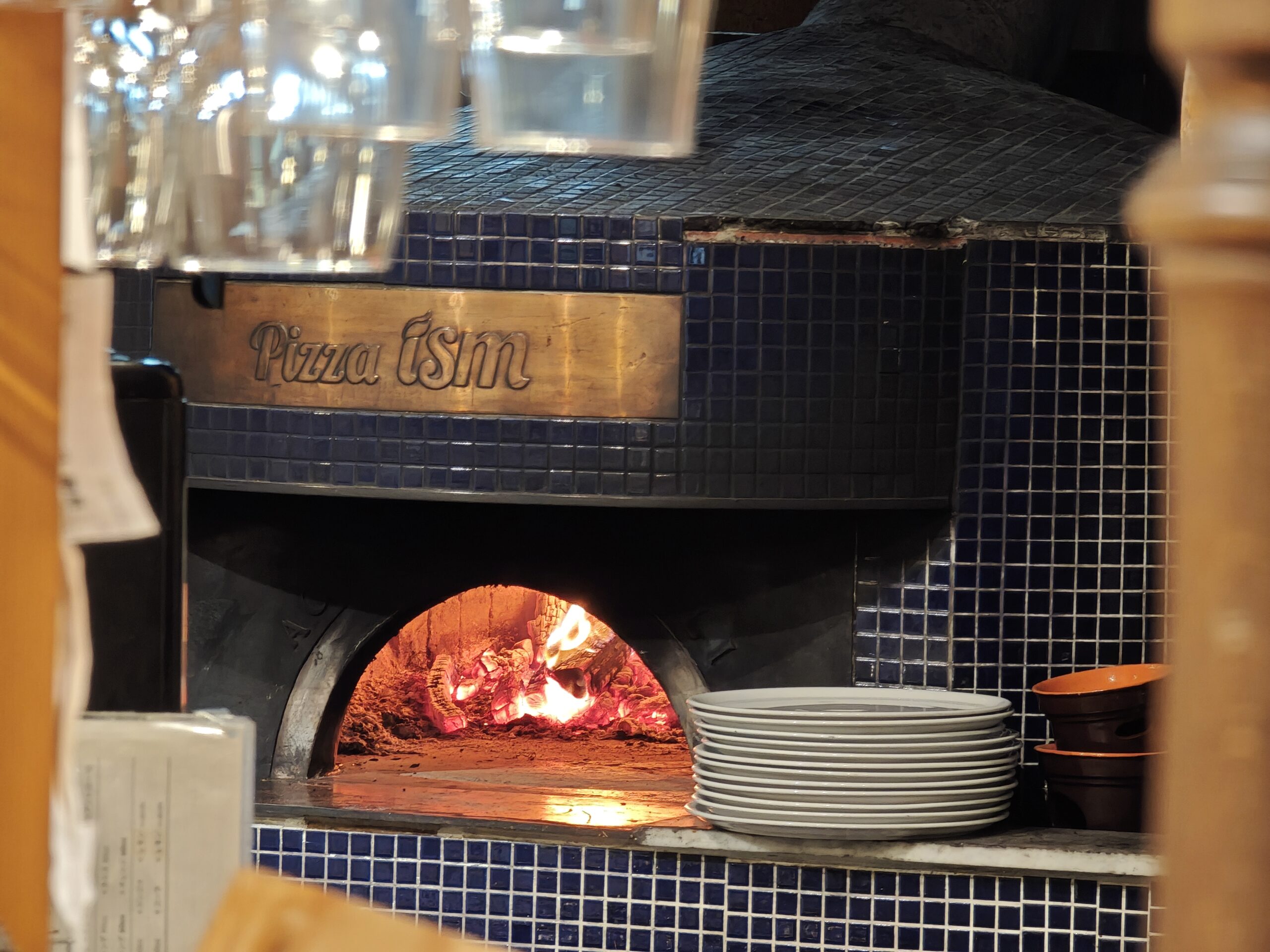 店主さんが定期的に薪を加えながらピッツァを手際よく焼いている姿が見えました。