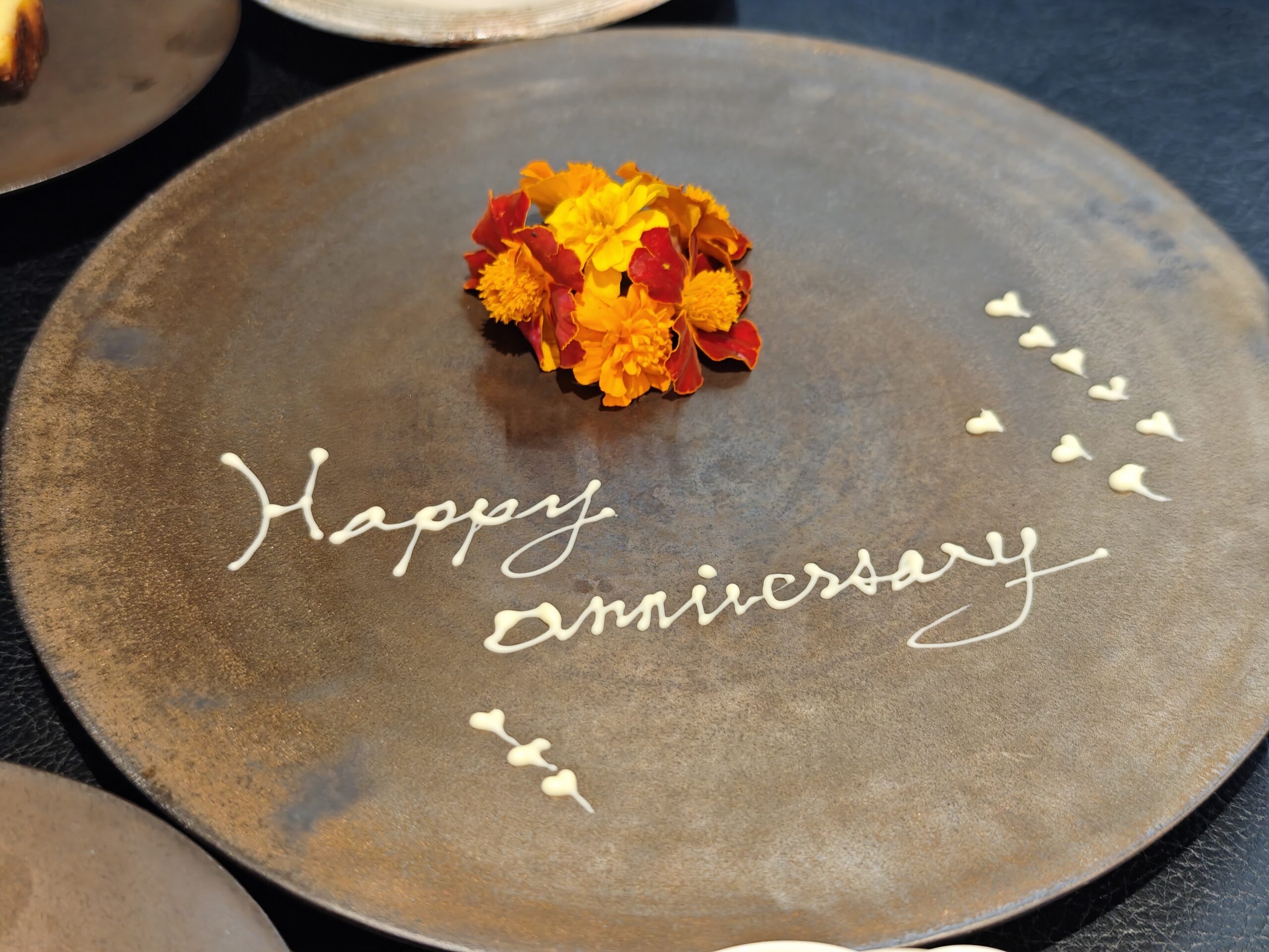 予約時に結婚記念日での利用とお伝えしたところ、シェフがお祝いのプレートを用意してくださいました