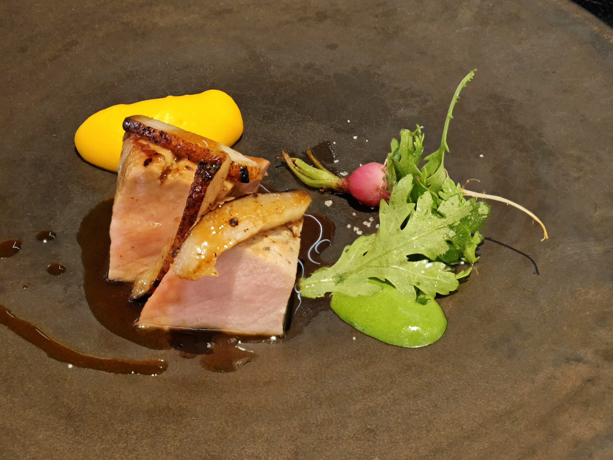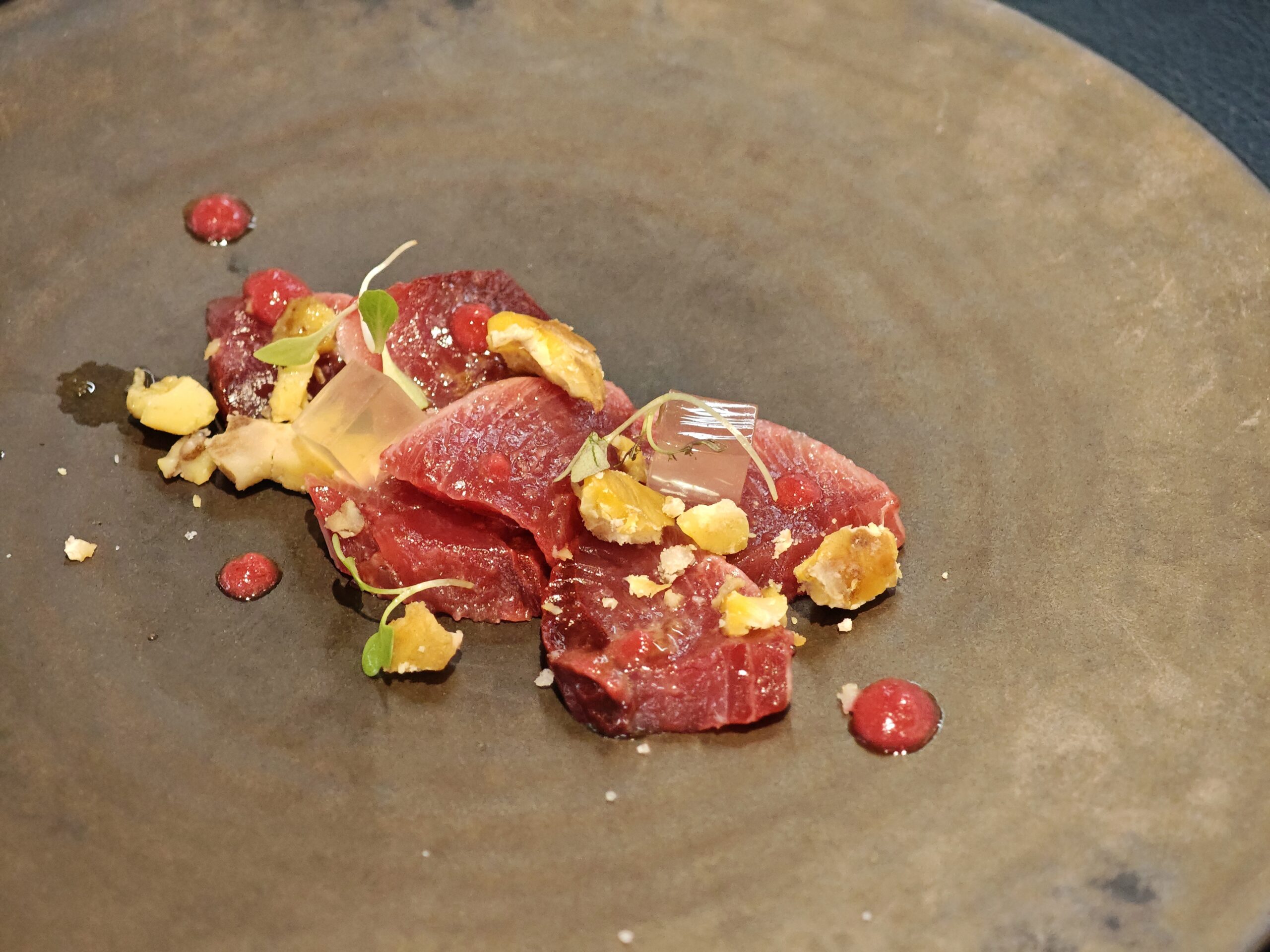 射水市小杉で採れたホクホクの栗(バターと鶏のブイヨンで丁寧に火入れ)と、ビーツのやさしい酸味がカツオと絶妙に調和していました
