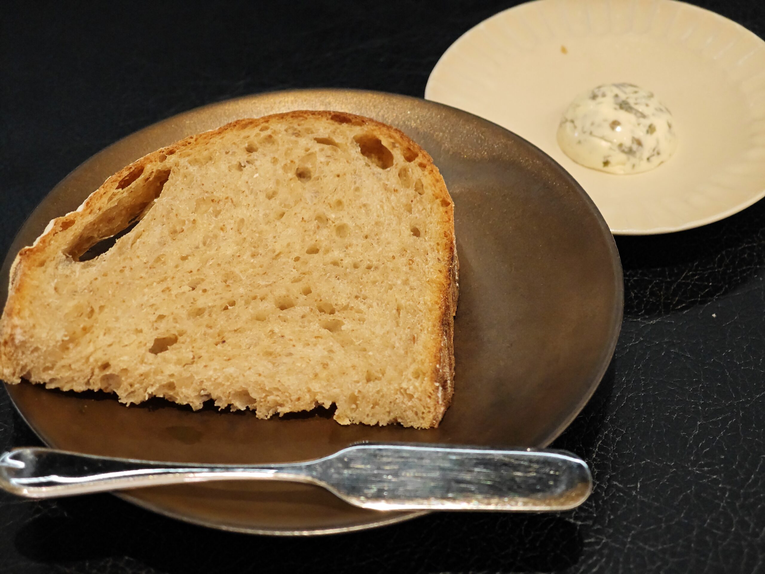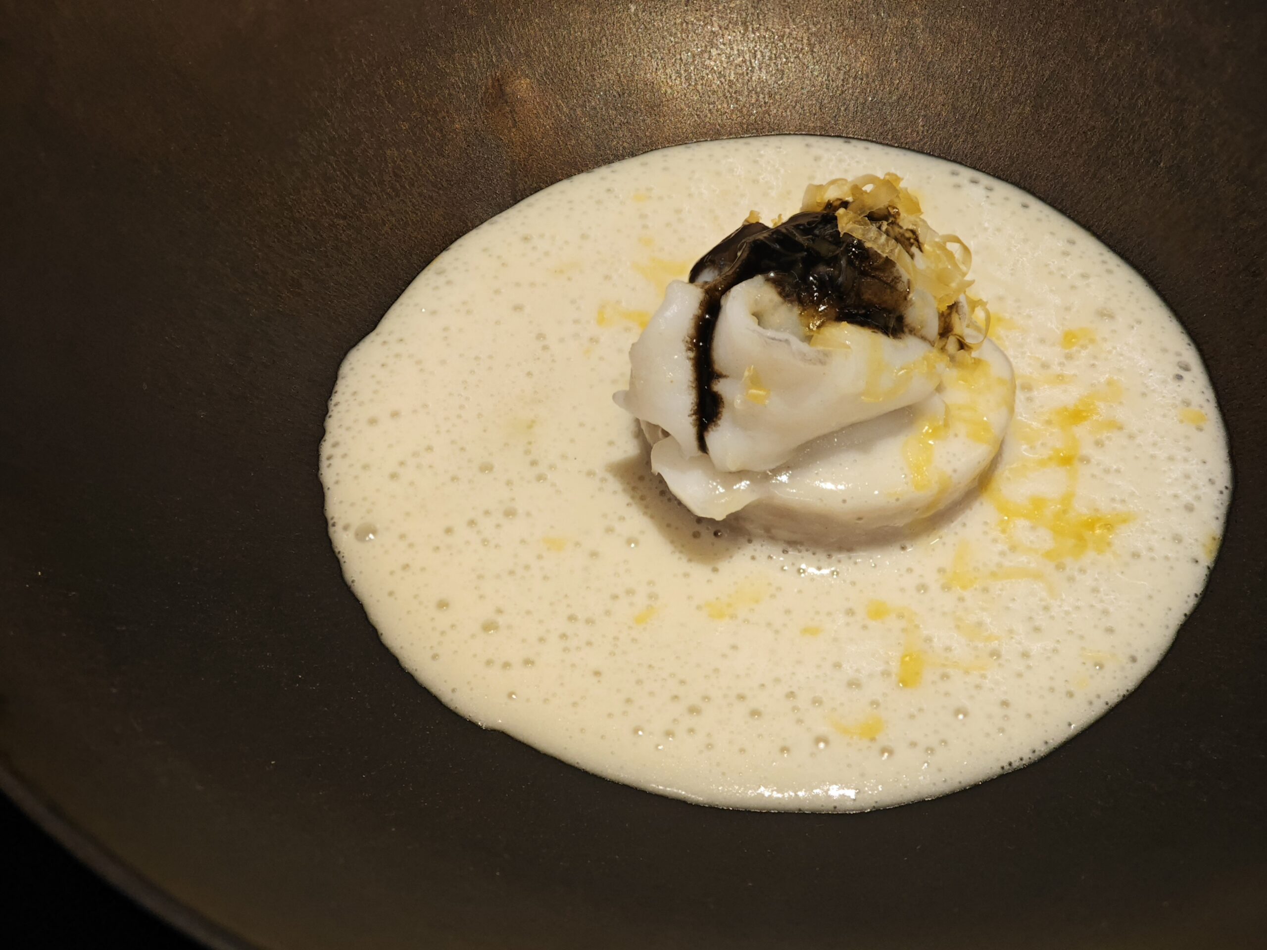 氷見産の「センバ (ウマヅラハギ)」に、椎茸の旨みをぎゅっと濃縮したペースト(デュクセル)が たっぷり。