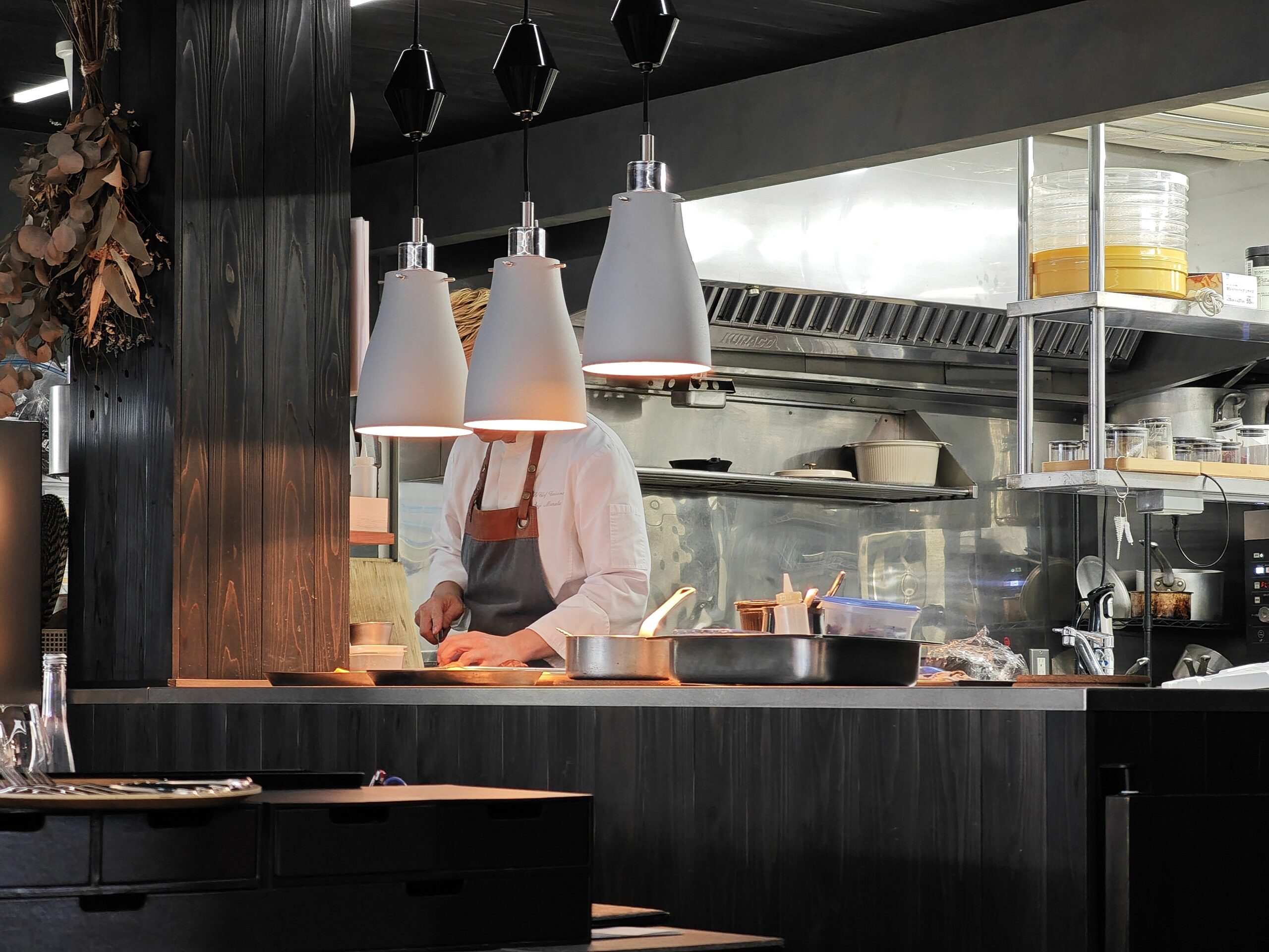 奥にはオープンキッチンがあり、シェフが丁寧な手仕事を眺めることができます
