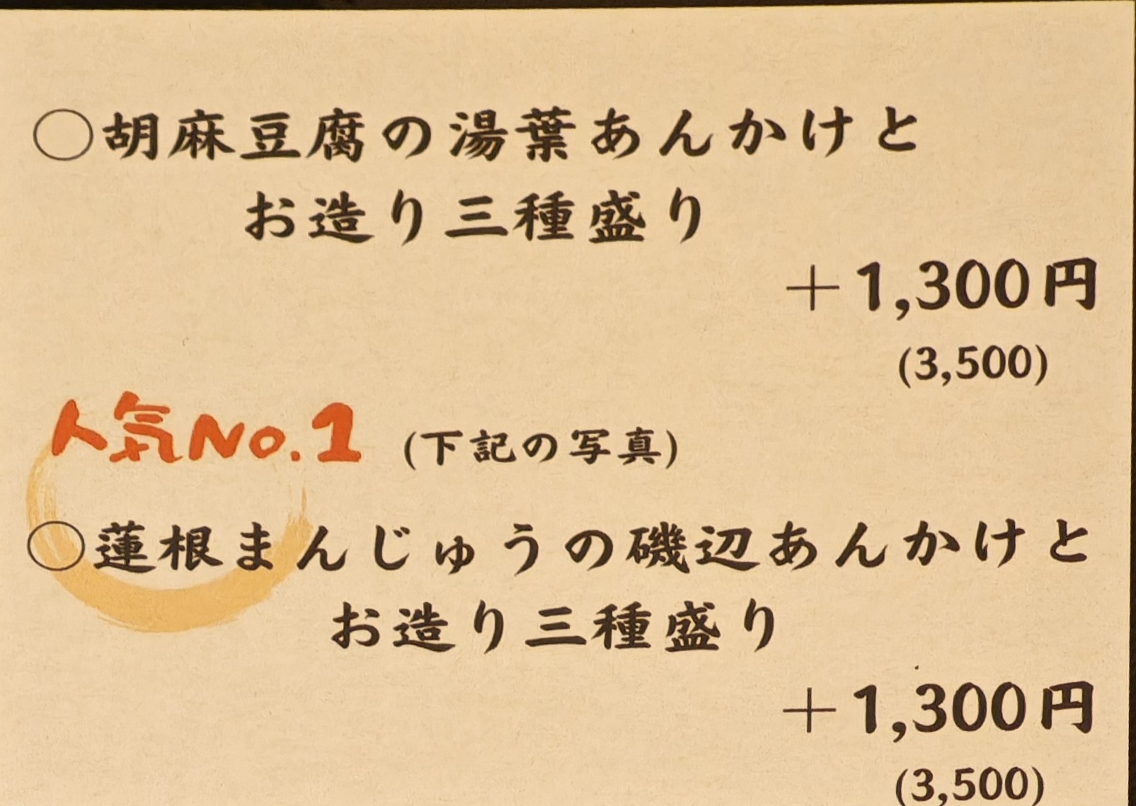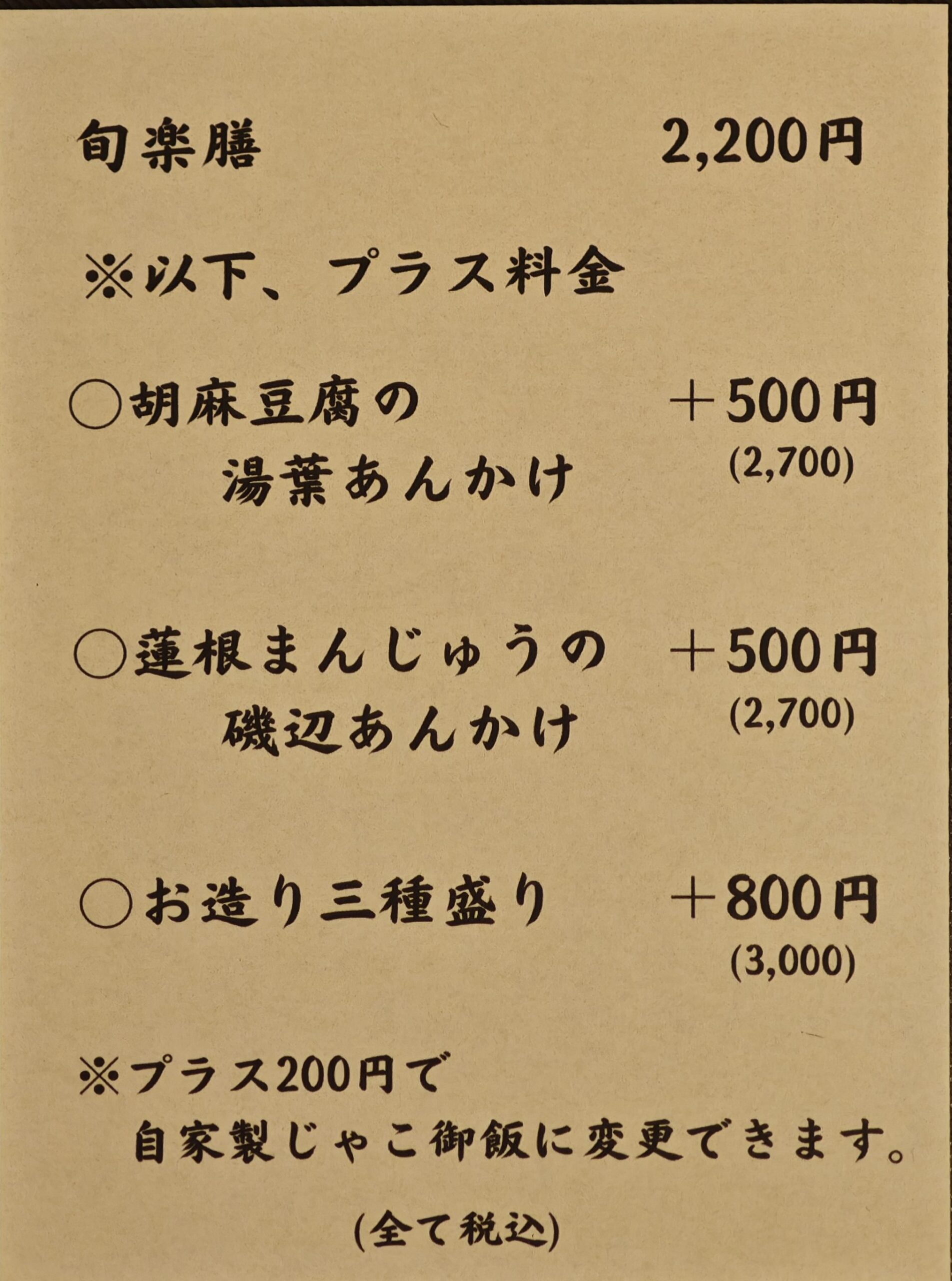 旬楽膳(税込2,200円)+蓮根まんじゅう磯部あんかけとお造り三種盛り(税込1,300円)